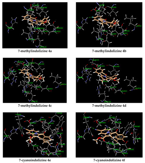 Two novel 2-phenylindolizine series, 7-methyl, and 7-cyano were investigated for COX-2 inhibitory activity. The bioactivity study revealed that 7-cyanoindolines were more active than their congener 7-methylindolizines. To gain insights into the potency of the synthesized indolizines, the key interactions between the compounds and COX-2 active site were examined through molecular docking study and reported in Table 4. Molecular modeling analysis showed two distinct binding modes for each series (Figure 4). The indolizino ring of 7-cyano series was pointed toward the residue HIS 90 participating in hydrogen bonding with cyano group at position 7 (compounds 4e–g, Figure 4), whereas the indolizino ring of 7-methyl series was projected toward the amino acid ARG 120 by interacting with the indolizino ring through pi–cation interaction (compounds 4b–d, Figure 4). The different conformation in binding site between the two series may explain the observed COX-2 activity. In the 7-methyl series, the hydrophobic interactions were mainly observed between the residues VAL 116, LEU 359, LEU 531 and methyl at position 7, and the amino acids HIS 90, ARG 513, ALA 516 and chlorine (4c) and bromine (4d) at the benzoyl ring with the exception of 3-(4-fluorobenzoyl) indolizine 4b (Figure 4). The latter exhibited strong hydrogen bonding with the residue HIS 90 and fluorine. The 7-cyanoindolizines 4e–g displayed strong H-bond with the residue HIS 90 and the cyano group at position 7 conferring greater inhibitory activity over the 7-methylindolizines 4a–d. Another interesting binding feature between the two series is the involvement of the amino acid ARG 120 in pi–cation interaction observed for only the 7-methylindolizine series. The lack of selectivity between COX-2 and COX-1 inhibitors is due to the ion pair or/and hydrogen bonding interaction with ARG 120 [30,31,32]. The non-involvement of such interaction with the 7-cyanoindolizines 4e–g may exert greater selectivity over 7-methylindolizines 4a–d.