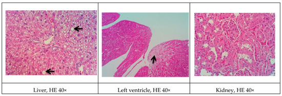 After euthanasia, the heart, right kidney, and liver were cleaned, weighed, and longitudinally sectioned. The relative organ weight was determined as the following: Relative Weight (RW)% = absolute organ weight × 100/body weight.