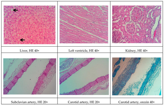 Representative cross-sections of the liver, left ventricle, kidney, and subclavian and carotid arteries in the control group. HE, hematoxylin-eosin staining.