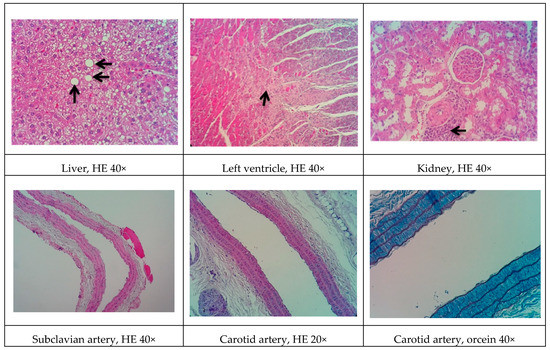 Representative cross-sections of the liver, left ventricle, kidney, and subclavian and carotid arteries in the NEAD group. Black arrows indicate cardiac fibrosis, lipid macrovesicles in the liver, and lipid striae in the arteries. HE, hematoxylin-eosin staining; NEAD, normotensive and non-ovariectomized rats that received the atherogenic diet, methimazole, and cholecalciferol.