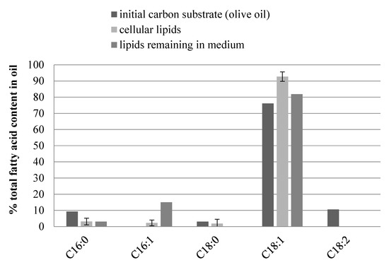 An interesting relation could be observed when analyzing changes in the composition of fatty acids present in acylglycerols in cellular lipids and in olive oil constituting the initial carbon source in medium and the composition of fatty acids in the oil remaining in the medium after yeast growth (Figure 3). Olive oil used as a carbon substrate contained the highest content of oleic acid (76.10% of all fatty acids) in comparison to the oil remaining in the medium (84%, Figure 3). In the initial carbon source, palmitic (C16:0) and linoleic (C18:2) acids were detected in the amount of 9.30% and 10.60%, respectively. No palmitoleic acid (16:1) was found in the olive oil as opposed to the residual oil, where it accounted for 15.06%. On the other hand, no stearic acid was detected in lipids remaining in culture medium. The residual oil not used by Y. lipolytica yeast growth was therefore less diverse in terms of the fatty acid composition than the initial carbon substrate.