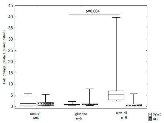 The results obtained in the CT values from real time-qPCR experiments were analyzed using a U Mann-Whitney test (Statistica 9.0, Statsoft, Kraków, Poland). Statistical analyses of results on fatty acid content were performed of repeated measurements with one-way ANOVA followed by Tukey’s multiple comparison test and analysis of correlation using STATISTICA 13.0 (Statsoft, Kraków, Poland). p values of p ≤ 0.05 were considered to be statistically significant.