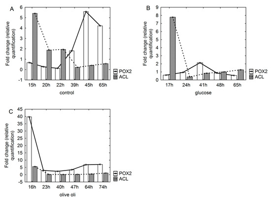Changes in POX2 and ACL gene expression during Y. lipolytica batch bioreactor culture in (A) control YPG medium, (B) MG7 medium (containing glucose) and (C) MO5 medium (containing olive oil).