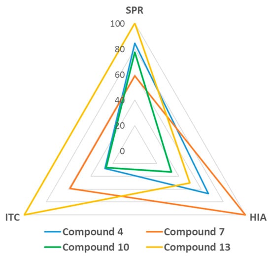 | Compound 13 | −134.0 ± 1.45 | 95.7 ± 12.15 | −38.1 ± 4.42 |