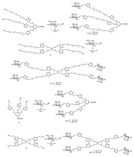 - Soomro, Z.H.; Cecioni, S.; Blanchard, H.; Praly, J.P.; Imberty, A.; Vidal, S.; Matthews, S.E. CuAAC synthesis of resorcin[4]arene-based glycoclusters as multivalent ligands of lectins. Org. Biomol. Chem. 2011, 9, 6587–6597. [Google Scholar] [CrossRef] [PubMed]