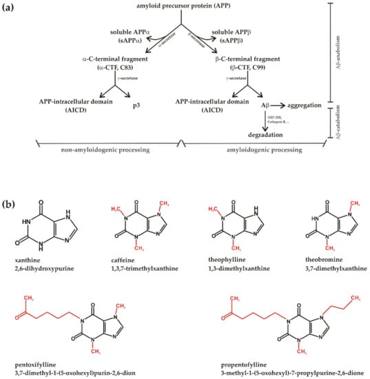 (a) Model of non-amyloidogenic and amyloidogenic processing of the amyloid precursor protein (APP) with subdivision into anabolism and catabolism of the neurotoxic APP cleavage product Aβ. The involved secretases and the resulting products are illustrated. (b) Chemical structures of xanthine (2,6-dihydroxypurine) and the analyzed methylxanthines (MTXs) caffeine (1,3,7-trimethylxanthine), theophylline (1,3-dimethylxanthine), theobromine (3,7-dimethylxanthine), pentoxifylline (3,7-dimethyl-1-(5-oxohexyl)purin-2,6-dion) and propentofylline (3-methyl-1-(5-oxohexyl)-7-propylpurine-2,6-dione). In red color the structural differences between the MTXs are highlighted.