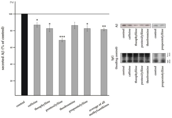Therefore, the aim of the study was to (I) further elucidate the molecular mechanism especially of caffeine on the protective effect in respect to AD focusing on the Aβ metabolism and (II) compare these effects with the other two mainly naturally occurring MTXs theophylline and theobromine and two synthetic MTXs propentofylline and pentoxifylline widely used as a drug having a higher affinity to adenosine receptors compared to the naturally occurring MTXs.
