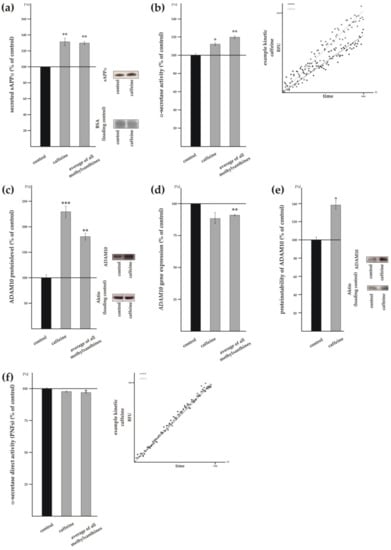 Beside the indirect effect of MTXs on non-amyloidogenic APP processing, MTXs might also directly affect α-secretase activity. To evaluate whether MTXs have a direct effect on α-secretase activity we prepared post nuclear fractions of SH-SY5Y wt cells, incubated them with MTXs in a cell free assay and measured α-secretase activity. Caffeine (Figure 3f) as well as theophylline, pentoxifylline, theobromine and propentofylline (Supplement Figure S2e) slightly but not significantly reduced α-secretase activity (caffeine: 97.7% ± 0.9%, p = 0.1790; theophylline: 97.5% ± 3.2%, p = 0.4904; pentoxifylline: 93.6% ± 2.4%, p = 0.0628; theobromine: 97.9% ± 3.1%, p = 0.5708; propentofylline: 97.6% ± 2.3%, p = 0.3980). However, as the analyzed MTXs consistently showed a slight reduction, the average of all MTXs revealed a minor but significant direct effect on α-secretase activity (MTXs averaged: 96.9% ± 0.8%, p = 0.0159) (Figure 3f). However, as the observed effect is not significant for the individual MTXs and the average effect strength is 3.1%, a direct effect on α-secretase activity does not mainly influence the increased α-secretase processing in presence of MTXs.