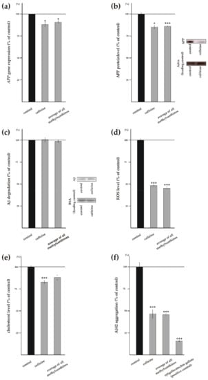 Total Aβ level and AD pathogenesis are not only dependent on amyloidogenic and non-amyloidogenic APP processing, but rather are determined by additional cellular processes involved in Aβ homeostasis like e.g., gene and protein expression of the Aβ precursor APP, degradation of Aβ peptides and the level of reactive oxygen species (ROS) and of cholesterol. Gene expression of APP was significantly reduced to 88% ± 4.6% (p = 0.0280) in caffeine-treated SH-SY5Y wt cells (Figure 5a). The average of all analyzed MTXs also revealed a significant reduction in APP gene transcription to 90.8% ± 2.9% (p = 0.0349). Besides propentofylline, all tested MTXs individually significantly reduced APP gene transcription (theophylline: 83.2% ± 3.2%, p ≤ 0.001; pentoxifylline: 93.3% ± 2.7%, p = 0.0148; theobromine: 88.8% ± 2.5%, p = 0.0015; propentofylline: 100.6% ± 13.0%, p = 0.9614) (Supplement Figure S4a). In line with these results, protein level of APP was also significantly reduced to 85.4% ± 3.6% (p = 0.0118) in presence of caffeine (Figure 5b). Similarly, the average of all MTXs revealed a significant reduction of the APP protein level to 86.2% ± 1.2% (p ≤ 0.001), which is also in line with the observed reduced APP gene transcription. In detail, theophylline and pentoxifylline showed a reduction to 90.5% ± 4.2% (p = 0.1027) and 83.7% ± 6.7% (p = 0.0511), respectively (Supplement Figure S4b). However, statistical analysis did not reach significance. A significant reduction of the APP protein level was obtained for theobromine and propentofylline that reduced APP protein level to approximately 86% (theobromine: 85.5% ± 5.7%, p = 0.0483; propentofylline: 86.1% ± 5.0%, p = 0.0437) (Supplement Figure S4b). These results indicate that MTXs also reduce total Aβ level by a decrease in APP gene expression accompanied by reduced APP protein level.
