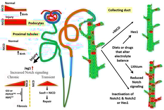 Other studies point to a role for increased Notch signaling activity in the epithelial cells of the distal nephron segments to remodel the cell types in response to inactivation of the sodium chloride cotransporter (NCC). The distal nephron remodeling process is observed to involve induction of Jagged1/NOTCH signaling, and increased Hes1 levels. This then results in an increase in PCs within the cortical connecting tubule and replacement of acid-secreting alpha-ICs with pendrin expressing-ICs [43]. Hence, modulating Notch signaling within the adult kidney epithelial cell types of the distal nephron and collecting duct segments may be part of chronic physiologic adaptive mechanisms.