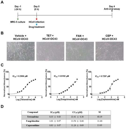 Antiviral activities of TET, FAN, and CEP in MRC-5 cells. MRC-5 cells were infected with human coronavirus (HCoV)-OC43 with or without the addition of two-fold serial dilutions of the compounds. (A) Overall scheme for MRC-5 cell infection and treatment with TET, FAN, and CEP. (B) Live photo image of MRC-5 at four dpi. (C) The inhibitory concentration (IC50) values of the compounds were calculated at four dpi by nonlinear regression analysis. (D) Lists the IC50, cytotoxic concentration (CC50), and selectivity indices (CC50/IC50, SI) values. Data are presented as mean ± SEM of three independent experiments.
