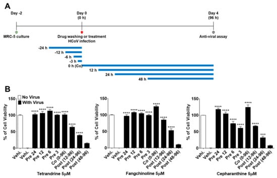 To more precisely verify the antiviral effects of TEN, FAN, and CEP over time, MRC-5 cells were treated with 5 μM concentrations of the compounds at 24, 12, 6, and 3 h before HCoV-OC43 infection, during infection, and at 12, 24, and 48 h post-infection (Figure 4A). As shown in Figure 4B, the viability of MRC-5 cells treated with the compounds before virus infection was increased as compared with that of the control vehicle group. Notably, TET, FAN, and CEP had highly effective antiviral activities for only 3 h of treatment before HCoV-OC43 infection, although CEP (61.1%) was not as effective as TET and FAN. In contrast, the viability of cells treated with the three compounds at 48 h after infection was similar to that of the untreated group, suggesting no antiviral effect at 48 h after infection. Together, these data suggest that TET, FAN, and CEP have antiviral activities for only 3 h of treatment before HCoV-OC43 infection and for 48 h of treatment after infection. These results indicate that TET, FAN, and CEP are most effective at the early stage of the HCoV-OC43 life cycle, and the timing of treatment is more important to protect against virus-induced cell death rather than the duration of cell exposure to the compounds.