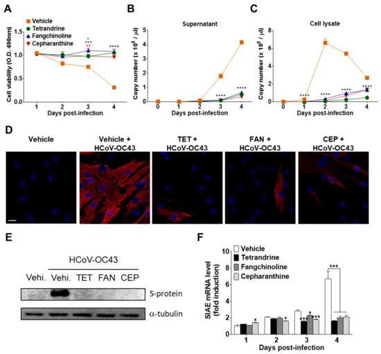 To investigate the effects of the compounds on virus replication, MRC-5 cells were infected with HCoV-OC43, and the compounds (5 μM) were added (co-treatment). The supernatants and cell lysates were harvested at 1, 2, 3, and 4 dpi. The abundance of viruses in the supernatants and cell lysates was quantified by measuring the HCoV-OC43 N protein RNA levels by qRT-PCR. As shown in Figure 5A,B, virus infection promoted cell death and increased the release of HCoV-OC43 into the supernatants in a time-dependent manner. However, treatment with TET, FAN, and CEP significantly inhibited virus-induced cell death and the release of the virus into the supernatant. Moreover, the copy number of viral RNA peaked at two dpi and then slowly decreased in MRC-5 cell lysates in the vehicle group. However, compound treatment significantly decreased the copy number of viral RNA in cell lysates (Figure 5C). These results show that TET, FAN, and CEP can inhibit the replication of HCoV-OC43 in MRC-5 cells. Next, HCoV-OC43 N protein in the MRC-5 cells was visualized using fluorescence microscopy. As shown in Figure 5D, most of the vehicle-treated cells expressed the N protein at two dpi, whereas treatment with TET, FAN, and CEP highly decreased the expression of the N protein in MRC-5 cells. Additionally, the expression level of the S protein was determined in the lysate of virus-infected MRC-5 cells by western blot analysis (Figure 5E). The expression levels of HCoV-OC43 S protein remarkably increased at two dpi, although the levels were undetectable in the lysate of MRC-5 cells at one dpi (data not shown). However, the S protein was undetectable following compound treatment. In addition, the mRNA levels of sialic acid acetylesterase (SIAE) [] were dramatically induced by HCoV-OC43 infection in MRC-5 cells at four dpi. The mRNA levels of SIAE following treatment with TET, FAN, and CEP were lower than with the vehicle control (Figure 5F). Collectively, these data suggest that TET, FAN, and CEP inhibited the replication of HCoV-OC43, the expression levels of the N and S proteins, as well as the virus-induced host response, as indicated by SIAE induction in MRC-5 cells.