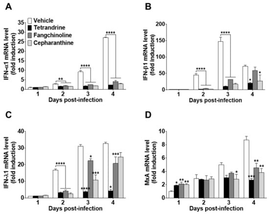 Reduced interferon (IFN)-related gene expression in TET-, FAN-, and CEP-treated HCoV-infected MRC-5 cells. The compounds (5 μM) were added to HCoV-OC43-infected MRC-5 cells. Total RNA was purified from MRC-5 cells at days 1, 2, 3, and 4. (A–D) The mRNA levels of (A) IFN-α1, (B) IFN-β1, (C) IFN-λ1, and (D) MxA genes were measured by qRT-PCR in vehicle (0.025% DMSO), TET-, FAN-, and CEP-treated cell lysates. β-Actin was used for data normalization. Data are presented as mean ± SEM of three independent experiments. * p < 0.05, ** p < 0.01, *** p < 0.001, and **** p < 0.0001 versus the vehicle group (one-way ANOVA plus Tukey’s multiple comparisons test).
