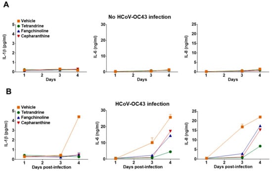 To determine whether TET, FAN, and CEP modulate cytokine expression in HCoV-OC43-infected cells, the kinetics of various inflammatory cytokines (i.e., TNF, IL-1β, IL-6, IL-8, IL-10, and IL-12p70) in the cell culture supernatant were evaluated at four dpi. Notably, TNF, IL-10, and IL-12p70 were not detected in the MRC-5 cell culture supernatant following compound treatment (data not shown). Additionally, treatment with the compounds did not induce MRC-5 to produce the inflammatory cytokines IL-1β, IL-6, and IL-8 (Figure 7A). As shown in Figure 7B, the expression levels of IL-1β, IL-6, and IL-8 were significantly upregulated by virus infection, but were reduced in the compound-treated group. These data indicate that HCoV-OC43 induced an antiviral response, and inflammatory cytokine production was reduced by treatment with TET, FAN, and CEP.