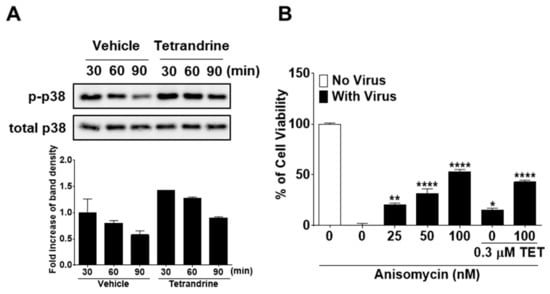 Several studies have reported that TET enhances the phosphorylation of p38 MAPK [,]. Therefore, to further elucidate the mode of action of TET in response to HCoV-OC43 infection, we investigated whether the p38 MAPK signaling pathway is activated by TET in virus-infected MRC-5 cells. The results showed that in HCoV-OC43-infected MRC-5 cells, p38 phosphorylation peaked at 30 min post-infection and then slowly decreased at 60 and 90 min. TET treatment induced an increase in the phosphorylation of p38 MAPK as compared with the vehicle-treated group (Figure 8A). To determine whether the activation of p38 MAPK has a role in the antiviral responses of host cells, virus-infected MRC-5 cells were treated with the MAPK signal activator ANM with and without 0.3 μM TET. As shown in Figure 8B, virus-induced cell death was decreased by ANM treatment in a dose-dependent manner with no indication of cytotoxicity, although the addition of ANM did not fully recover cell viability even at a concentration of 100 nM. However, the viability of HCoV-OC43-infected MRC-5 cells was similar to 100 nM ANM + 0.3 μM TET versus 100 nM ANM, suggesting that there was no synergistic effect of TET and ANM against HCoV-OC43. Collectively, these data indicate that TET induced the activation of p38 MAPK in HCoV-OC43-infected MRC-5 cells, and although the MAPK signal activator ANM had a partial antiviral effect, there was no synergistic effect of TET and ANM.