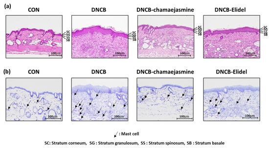 To examine histologic changes, dorsal skins were fixed in 10% formalin for 24 h and embedded in paraffin. Fixed tissues were sectioned at 2–3 mm, dried for 24 h at 37 °C, and stained with hematoxylin and eosin (H&E) or toluidine blue. Histological changes were observed under an optical microscope (Olympus CX31/BX51, Olympus Optical Co., Tokyo, Japan) and photographed (TE2000U, Nikon Instruments Inc., Melville, NY, USA).