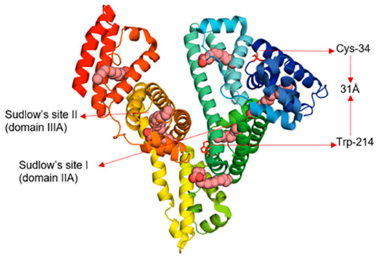 Human serum albumin (HSA) is the most abundant protein in human plasma with typical concentrations around 0.7 mM [1]. Serum albumin binds ligands such as fatty acids, glucose, drugs, excess copper, and hormones and aids in their transport, distribution, and metabolism. HSA comprises 585 amino acids, arranged mainly in alpha helices and stabilized by 17 disulfide bonds, leaving one free cysteine (Cys-34) [2,3]. The native protein has three structurally similar domains, and each domain can be divided into two subdomains, A and B. The two well-known drug-binding sites, Sudlow’s sites I and II, are hydrophobic pockets in subdomains IIA and IIIA, respectively (Figure 1) [2,4]. The single Trp residue is in subdomain IIA. HSA in solution includes 60–70% monomers with the remainder forming dimers or larger oligomers [5]. Addition of ligands such as drugs and peptide linkers can promote protein dimerization and ultimately aggregation through cross-linking [6].