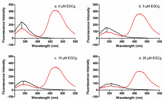 Fluorescence emission spectra for 1 μM HSA (black) and HSA-CPM (red) with 0 μM (a), 5 μM (b), 10 μM (c), 25 μM (d) EGCg. The difference in intensity at 340 nm (Δem) between HSA and HSA-CPM (green line) indicates the energy transfer.