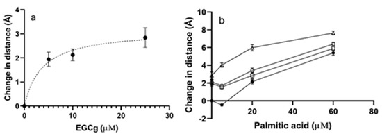 EGCg increased the distance between Trp-214 and CPM-Cys-34 in the absence of PA (Figure 4a, Table S2). The maximum increase detected was 2.8 ± 0.7 Å at a molar ratio of 25 EGCg to 1 HSA (Figure 4a). The effect was dose dependent and fit a one binding site isotherm, with a calculated maximum change in distance of 3.2 Å and an apparent EC50 of 3.7 μM. The effect of PA on the protein was more complex (Figure 4b, Table S2). A small amount of PA added to the protein decreased the distance between Trp-214 and CPM-Cys-34 slightly, indicating that fatty acid at a low level made the structure somewhat more closed. Excess PA relaxed the protein, increasing the distance between the domains. The maximum decrease in distance induced by PA was 0.5 +/− 0.1 Å, while the maximum increase was 5.4 +/− 0.5 Å (Figure 4b). Palmitic acid induced larger changes in the protein structure than EGCg.