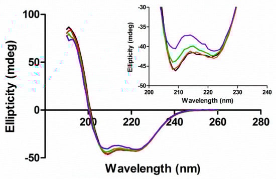 Circular dichroism was used to assess the secondary structure of HSA in the presence of EGCg and/or PA. A CD spectrometer MODEL 435 from AVIV biomedical, Inc. was used to measure the spectra at 25 °C in a quartz cuvette with 1 mm path length. The bandwidth was set at 1 nm, the speed was set at 50 nm min−1, and the data were collected from 260 to 190 nm. Each spectrum was the average of three scans and three independent replicates of each sample were analyzed. For each sample, a background spectrum obtained with the appropriate concentration of EGCg was subtracted. To calculate the α-helical content in HSA at different conditions, the following Equations (5) and (6) were used [43].