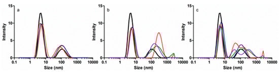 Dynamic light scattering (DLS) size distribution of (a) 5 μM HSA titrated with 0 μM (black), 25 μM (yellow), 100 μM (red), or 300 μM (blue) PA; (b) 5 μM HSA titrated with 0 μM (black), 25 μM (red), 50 μM (green), or 125 μM (purple) EGCg; (c) 5 μM HSA (black) and HSA (5 μM)-PA (300 μM) titrated with 0 μM (blue), 25 μM (red), 50 μM (green), or 125 μM (purple) EGCg.