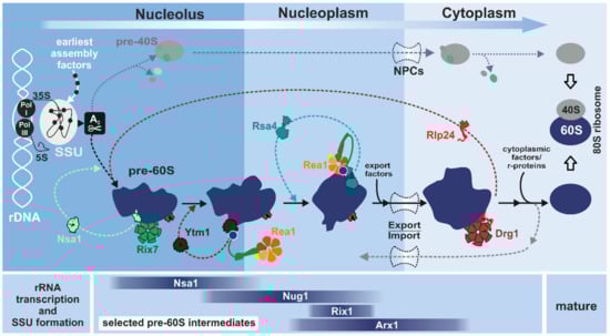 Eukaryotic ribosome biogenesis has been best characterized in the yeast Saccharomyces cerevisiae and begins in the nucleolus (Figure 1) with the transcription of ribosomal DNA (rDNA) by RNA polymerases I and III (recently reviewed in [3,4,5,6,19]). RNA polymerase III transcribes the precursor of the 5S rRNA while RNA polymerase I produces a long 35S transcript. This 35S pre-rRNA includes all the other rRNAs (25S, 18S, and 5.8S) separated by internal transcribed spacers (ITS) and flanked by external transcribed spacers (ETS), as reviewed in [20]. Loading of the first assembly factors including small nucleolar ribonucleoprotein particles (snoRNPs) onto this 35S pre-rRNA scaffold occurs co-transcriptionally and forms the small subunit (SSU) processome, the earliest pre-ribosomal particle [21,22,23] (recently reviewed in [24]). After two processing steps in the 3′ ETS of the 35S pre-rRNA, an endonucleolytic cleavage at site A2 within ITS1 separates the maturation pathways of the two ribosomal subunits. From this step on, the precursors of the small and the large subunits go through separated maturation pathways. While the pre-40S particle is rapidly exported and finalized in the cytoplasm (recently reviewed in [19]), pre-60S particles undergo a cascade of maturation steps during their journey from the nucleolus through the nucleoplasm and into the cytoplasm (recently reviewed in [5,25]). Intriguingly, the three yeast AAA-ATPases directly shaping pre-ribosomes, Ribosome export 7 (Rix7), named nuclear VCP-like protein 2 (NVL2) in humans, ribosome export/assembly 1 (Rea1), designated Midasin 1 (Mdn1), and diazaborine resistance gene 1 (Drg1), termed spermatogenesis-associated 5 (SPATA5) are all associated with the formation of the large 60S subunit [26]. This is likely explained by the fact that the maturation cascade of the large subunit involves more individual steps and a larger number of additional assembly factors compared to small subunit maturation.