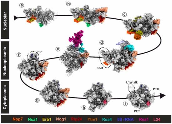 From the early nucleolar stage onwards, distinct maturation intermediates (pre-ribosomal particles) are characterized and classified by their association with specific maturation factors. Pioneering work from several laboratories has unveiled structural snapshots of several of these pre-60S precursor particles from yeast (Figure 2) [27,28,29,30,31,32,33,34,35,36,37]. Defining the structure and composition of these particles has uncovered the metamorphosis of the large ribosomal subunit during maturation; however, many gaps still remain in the blueprints of ribosome assembly (recently reviewed in [3,4,5,6]).