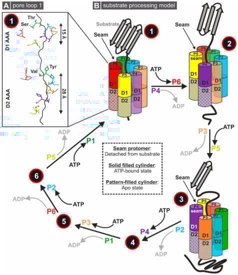 Working model for substrate translocation by Rix7. (A) Positions of pore loops 1 (PL-I) surrounding the bound substrate (threaded polypeptide, black cartoon). Individual protomers are colored as follows. P1: green, P2: cyan, P3: orange, P4: purple, P5: yellow, and P6: red. PL-I residues Thr276 and Ser277 in D1 domain and Tyr575 and Val576 in D2 domain, are shown as sticks. (B) Processive translocation model: Step 1: P1 binds the substrate at the top of the spiral configuration, followed by the next four protomers (P2–P5). The final protomer, P6 or seam, does not contact the substrate and is set back from the central channel. Although P5 contacts the substrate, the nucleotide binding site of the P5 D2 domain is empty, suggesting it has already hydrolyzed ATP and released ADP. Step 2: As ATP binds to the P6 D2 domain, P6 is enabled to reengage with the substrate and move to the location at the top of the spiral configuration. P5 then disengages from the substrate and takes over the position as the new seam protomer. ATP hydrolysis in the P4 D2 domain provides the energy to translocate the substrate. Steps 3–6: The process repeats sequentially on the D2 domains within the Rix7 hexamer through successive rounds of ATP hydrolysis. This working model is based on cryo-EM studies of the substrate bound C. thermophilum Rix7 (PDB ID: 6MAT). ATP-bound protomers are illustrated as solid-filled cylinders, whereas protomers without nucleotides are illustrated as pattern-filled cylinders.