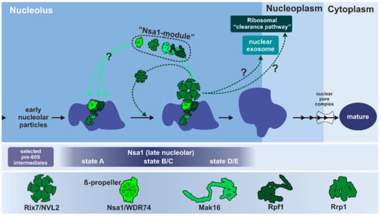 Rix7 has been proposed to act at this early stage of ribosome biogenesis to catalyze the timely removal of Nsa1 from the pre-ribosome (Figure 6) [80,81]. Released Nsa1 can then be recycled to associate with nascent pre-ribosomes. Inactivation of Rix7 blocks Nsa1 release and leads to the mislocalization of Nsa1 to the cytoplasm [81]. However, it remains unclear if removal of Nsa1 is the exclusive function of Rix7. On the pre-ribosome, Nsa1 is part of a protein sub-complex, termed the Nsa1-module, formed by assembly factors Nsa1, Rrp1, Rpf1, and Mak16, which cluster at the solvent-exposed surface of the pre-ribosome [3,31]. Nsa1 associates with pre-60S particles at a rather early maturation stage, when many fundamental structural features of the 60S subunit including the 5S RNP, the central protuberance, the PTC, and the PET are still in an immature state [31]. In contrast, the so-called “foot”-structure, which will be removed in the nucleoplasm, is already well developed in Nsa1 particles [27,33,99]. In addition to changes in the protein composition and conformation, the domain organization of the 25S rRNA is not fully established. As revealed by successive snapshots of the subsequent maturation stages, the initially rather flexible individual domains of the 25S rRNA will go through massive conformational rearrangements to be correctly incorporated into a compact particle [31]. This incorporation resembles an origami-like folding procedure where intermediate states presumably need the stabilization by varying modules of assembly factors.