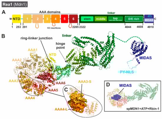 Structure of Rea1/Midasin 1 (Mdn1). (A) Rea1/Mdn1 is composed of a short N-terminal domain, followed by six adjacent AAA modules and the tail-like extension, all combined in one polypeptide chain. The linker is composed of a structured stem followed by a flexible D/E-rich region and connects the substrate-binding metal-ion-dependent adhesion site (MIDAS) domain to the AAA ring. The MIDAS domain also contains a PY-NLS needed to import Rea1 to the nucleus [126]. The six AAA modules that form the hexameric ring vary in size and partially contain additional helix insertions that can be involved in the interaction with the pre-ribosome [27]. (B) The AAA-domains and linker are taken from the cryo-EM reconstruction of S. cerevisiae Rea1 PDB ID: 6I26 [127] and the MIDAS domain from the recent crystal structure of the C. thermophilum MIDAS PDB ID: 6QT8 [126]. (C) Magnified interface created by two adjacent Rea1 AAA domains (AAA3-S and AAA4-L). (D) Weak density for MIDAS in contact with the ring detected in the cryo-EM reconstruction of S. pombe Mdn1 in the presence of ATP + Rbin-1 (PDB ID 6ORB) [128].