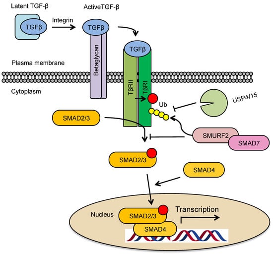 Schematic representation of transforming growth factor (TGF)-β/SMAD signaling. TGF-β is secreted in a latent form, which can be activated via integrin-dependent processes. Activated TGF-β initially engages with co-receptor beta glycan. Thereafter, it is passed on to TβRII that recruits TβRI forming a heteromeric signaling complex. Upon TβR1 phosphorylation and activation by TβRII kinase (phosphorylation indicated with red circle), SMAD2 and SMAD3 are phosphorylated (phosphorylation indicated with red circle) and form complexes with SMAD4. These complexes translocate into nucleus and act as transcription factors to regulate the expression of TGF-β signaling target genes. SMAD7, together with E3 ubiquitin ligase SMURF2, can induce proteasomal/lysosomal degradation of TβRI. This process can be reverted via the action of USP4/15 deubiquitinating enzymes.