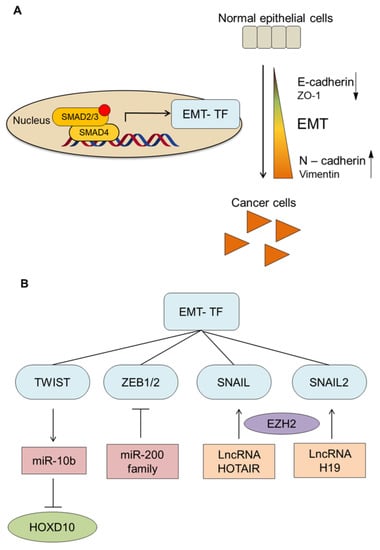 TGF-β signaling mediates EMT. (A) TGF-β is an important player in the activation of EMT, which is characterized by downregulation of epithelial markers and upregulation of mesenchymal markers. TGF-β via either SMAD or non-SMAD signaling can enhance the expression of EMT inducing transcription factors (EMT-TF) such as SNAIL1/2, ZEB1/2, and TWIST. (B) The involvement of miRNA and lncRNAs as important modulators of TGF-β signaling and EMT: miR-10b induces TGF-β-driven EMT by expression of HOXD10. MiR-200 family can negatively regulate ZEB1/2. LncRNA H19 upregulates EMT by interacting with SLUG or EZH2. LncRNA HOTAIR induces EMT by mediating the physical interaction between SNAIL and EZH2.
