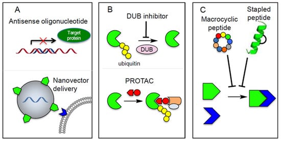Proteolysis-targeting chimeras (PROTACs) are bifunctional molecules that recruit a target protein to an E3 ubiquitin ligase, which initiates the protein degradation process. In principle, the target specific portion of PROTAC does not need to inhibit the protein’s function since the second molecule would tether the target protein to ubiquitin ligase, which conjugates ubiquitin to the target protein (Figure 6B). The prominent example of this concept is the development of PROTAC molecules for targeting androgen receptors. In 2019, the first oral PROTAC drug (ARV-110, targeting the androgen receptor for degradation) has been reported in phase I clinical trial for patients with metastatic castration-resistant prostate cancer (NCT03888612). This technology offers new opportunity for regulating “undruggable” targets [].