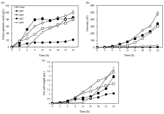 Effects of pH on (a) poly-(γ-glutamic acid) production, (b) viscosity, and (c) dry cell weight.