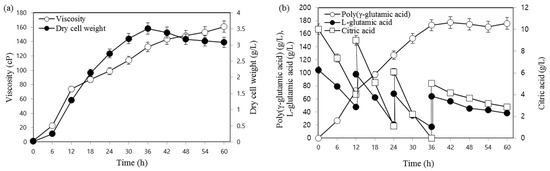 Poly-(γ-glutamic acid) production following the addition of L-glutamic acid, citric acid, and yeast extract. (a) Viscosity and dry cell weight; (b) poly(γ-glutamic acid) production and consumption of L-glutamic acid and citric acid.