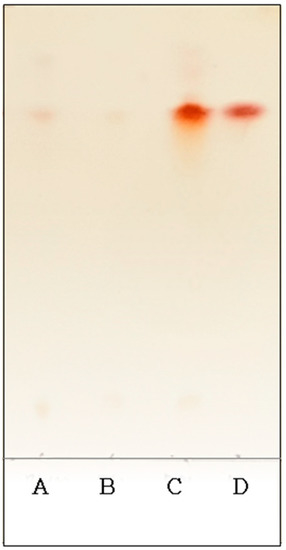 Thin layer chromatography of poly-(γ-glutamic acid) hydrolysate. Lane A, precipitated poly-(γ-glutamic acid); Lane B, after addition of HCl on poly-(γ-glutamic acid); Lane C, after addition of HCl on poly-(γ-glutamic acid) and heat treatment at 110 °C for 30 min; Lane D: glutamic acid standard.