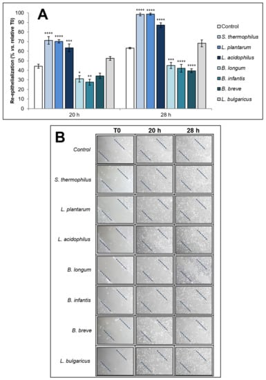Figure 1. Effect of the soluble fraction of bacterial lysates on re-epithelialization of HaCaT cell line scratched monolayers at different time points. (A) Effect of bacterial samples (50 µg/mL) on the wound closure rate (% vs. relative T0) of scratched monolayers at 20 and 28 h. Data are expressed as mean ± SEM of three independent experiments in duplicate. For comparative analysis of groups of data, a two-way analysis of variance (ANOVA) with post hoc Dunnett test was used. * p < 0.05, ** p < 0.01, *** p < 0.001, **** p < 0.0001 vs. control (untreated). (B) Representative images of HaCaT monolayer re-epithelialization in the absence (control) or presence of bacterial samples (50 µg/mL) at 20 and 28 h after injury (10× magnification).