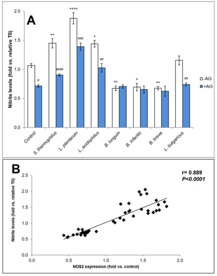 The ability of the bacterial samples to regulate NOS2 activity was analyzed by measuring nitrite levels in supernatants of scratched HaCaT monolayers pre-treated with or without the selective NOS2 inhibitor, AG (Figure 3A). Pre-treatment with AG prevented the increase of nitrite generation due to NOS activity induced by the scratch of control monolayer (p < 0.05), thus confirming our previous findings [39]. The treatment with S. thermophilus, L. plantarum, and L. acidophilus samples, able to up-modulate NOS2 expression, induced a significant increase of nitrite levels in culture medium versus control, even if at different extent (S. thermophilus, p < 0.01; L. plantarum, p < 0.0001; L. acidophilus p < 0.05). Of note, the stimulatory effect of S. thermophilus, L. acidophilus, and L. plantarum samples on nitrite generation was totally o partially prevented by pre-treatment with AG, thus supporting the ability of these probiotics to induce NOS2 expression and activity in our experimental conditions. On the contrary, B. longum, B. infantis, or B. breve samples induced a significant decrease of nitrite levels respect to control, confirming their inhibitory effect on NOS2 expression at a similar extent (B. longum p < 0.01; B. infantis p < 0.05; B. breve p < 0.01). In accordance with the results of experiments on NOS2 expression, pre-treatment with AG did not significantly influence nitrite levels in cell cultures treated with soluble fraction from B. longum, B. infantis, and B. breve lysates as compared to the monolayers treated with bacterial samples alone. The treatment with L. bulgaricus sample did not significantly influence nitrite levels compared to untreated cultures, in line with the above results on NOS2 expression and, like control condition, AG pre-treatment significantly decreased nitrite amounts as compared to the relative sample without AG. Using Pearson’s test, a significant linear positive correlation resulted between NOS2 expression (fold vs. control) and nitrite level (fold vs. relative T0) (r = 0.889; p < 0.0001) (Figure 3B).