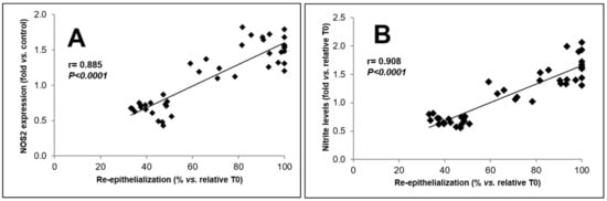 Figure 5. Analysis of correlation between NOS2 expression, nitrite levels, and wound closure rate. (A) Pearson’s test analysis of the correlation between NOS2 expression (fold vs. control) and wound closure rate expressed as % re-epithelialization vs. relative T0. (B) Pearson’s test analysis of correlation between nitrite levels (fold vs. relative T0) and wound closure rate expressed as % re-epithelialization vs. relative T0.
