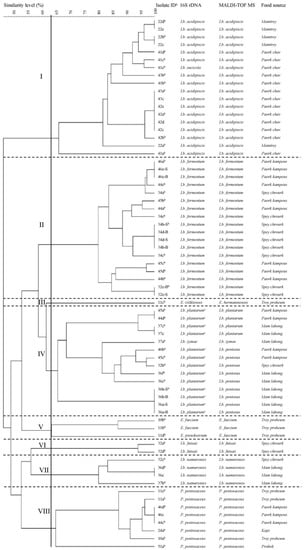 - Dušková, M.; Šedo, O.; Kšicová, K.; Zdráhal, Z.; Karpíšková, R. Identification of lactobacilli isolated from food by genotypic methods and MALDI-TOF MS. Int. J. Food Microbiol. 2012, 159, 107–114. [Google Scholar] [CrossRef]
