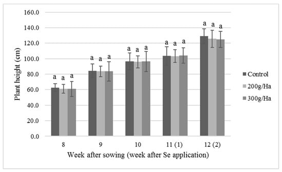 Comparison of the progressive heights of soybean plants at different weeks after sowing (in parenthesis, weeks after selenium application). subjected to different foliar selenium fertilization rates. Values are means, and bars indicate standard deviations (n = 24). The same letter within the week indicates no statistical difference (Tukey’s test p < 0.05).