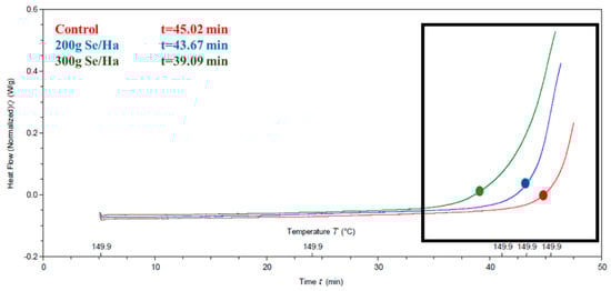 When assessing the effect of selenization on olives [] and chickpea sprouts [], an improved oxidation stability was observed. These results encouraged us to evaluate if soybean oil OIT values can be increased through the stress induced by the application of selenium, so that a higher shelf life can be achieved without the use of natural or synthetic antioxidants, such as butylated hydroxyanisole (BHA) or butylated hydroxytoluene (BHT). These synthetic antioxidants have been frequently questioned regarding their toxicity and are considered non-GRAS [].