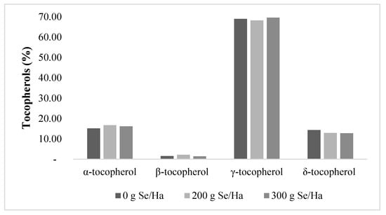 Tocopherols are potent antioxidants in vegetable oils at low concentrations and protect polyunsaturated fatty acids from lipid peroxidation. In addition, they protect humans from oxidative stress and cancer []. In soybean oil, tocopherols can be found as α, β, γ, and δ, the last two with the highest antioxidant efficiency []. Figure 3 shows tocopherol contents. γ-tocopherol was slightly higher, with 69.6% of the total content, in the 300g Selenite/Ha treatment, while it represented 69.0 and 68.2% of the control and 200 g Selenite/Ha counterparts, respectively. The second most abundant was the α-tocopherol. The treatment with 200 g Selenite/Ha contained the highest amount with 16.7% followed closely by the 300 g Selenite/Ha (16.15%) and control (15.1%) oils. The third most abundant tocopherol was the δ with 14.3% for control followed by oils extracted from the 200 and 300 g Selenite/Ha treatments, which contained 12.9 and 12.8%, respectively.