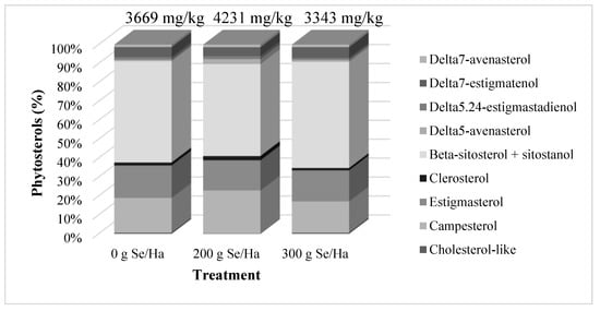 Sterols are minor components in vegetable oils, but they are considered the most important non-saponifiable lipidic fraction [] and have recently received attention due to their proven hypocholesterolemic effects [,]. Total phytosterols in soybean oils were in a range of 3343 to 4231 mg/kg. The lowest amount was found in oils from the 300 g Selenite/Ha, followed by control and 200 g Selenite/Ha. As described in Figure 4, the most abundant phytosterol was the beta-sitosterol + sitostanol, in a range from 48.6 to 56.1% of total phytosterols. The second most relevant was campesterol (16.5–22.7%), followed by stigmasterol (16.0–17.2%). Even when there were no differences among treatments, a small increase in beta–sitosterol + sitostanol was observed in the oil extracted from the 300 g/Ha treatment.