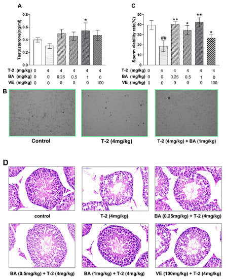 Figure 1. The effects of betulinic acid (BA) on testosterone secretion, quality of sperm and testis structural damage induced by T-2 in mice. (A) Testosterone secretion; (B) sperm morphology photo (4×); (C) sperm viability rate; (D) testis morphology of structural damage (40×). The values are presented as the mean ± SEM. Compared with the control group, ## p < 0.01, and compared with T-2 toxin group, * p < 0.05, ** p < 0.01.