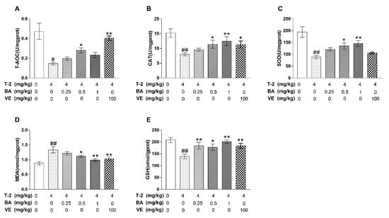 Figure 2. The effects of BA on oxidative stress induced by T-2 in mice. (A) Total antioxidant capacity (T-AOC) level; (B) catalase (CAT) level; (C) superoxide dismutase (SOD) level; (D) malondialdehyde (MDA) content; (E) glutathione peroxidase (GSH) content. The values are presented as the mean ± SEM. Compared with the control group, # p < 0.05, ## p < 0.01, and compared with T-2 toxin group, * p < 0.05, ** p < 0.01.