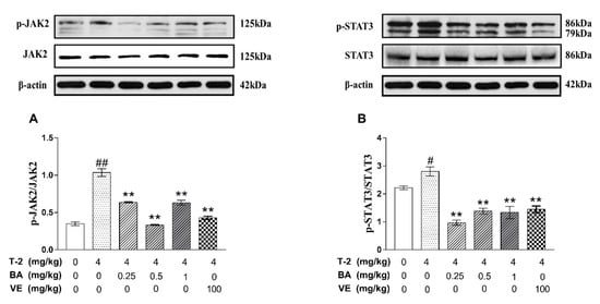 Figure 4. The effects of BA on activity of protein in JAK2, STAT3. (A) The phosphorylation of JAK2 was analyzed by western blot, and the ratio of p-JAK2/JAK2 was significantly increased by T-2 toxin treatment; (B) the phosphorylation of STAT3 was analyzed by western blot, and the ratio of p-STAT3/STAT3 was significantly increased by T-2 toxin treatment. The values are presented as the mean ± SEM. Compared with the control group, # p < 0.05, ## p < 0.01, and compared with T-2 toxin group, ** p < 0.01.