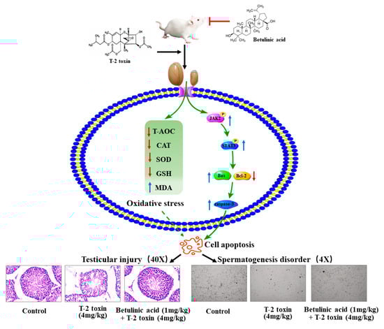 In summary, this work showed that T-2 toxin exposure induced testicular structural damage, decrease the serum testosterone content, and decrease sperm viability via triggering oxidative stress in the testis and promoting apoptosis in mouse testes. The natural product betulinic acid has the ability to ameliorate T-2-toxin-induced oxidative stress and diminish T-2-toxin-induced apoptosis via the JAK2/STAT3 and BAX/BCL-2/caspase-3 pathways (Figure 5). These outcomes protect the testis from damage and increase the serum testosterone content and sperm viability. This work provides insight into the potential of betulinic acid as an antimycotoxin agent that protects the reproductive system.