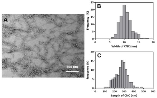 The CNC suspension was diluted to 0.1% (w/v) for calculating length, width, and thickness with a transmission electron microscope (TEM, JEM1010, JEOL, Tokyo, Japan). The CNC was loaded on a glow-discharged carbon copper grid and was then treated with a 10 µL uranyl acetate solution (1% w/v) for negative staining. The grids were dried at room temperature for 30 min, and the dried grid was used to obtain images of CNCs [36]. The length and width of the CNCs were measured from the TEM images using the ImageJ program, and the CNC sample number was 300.